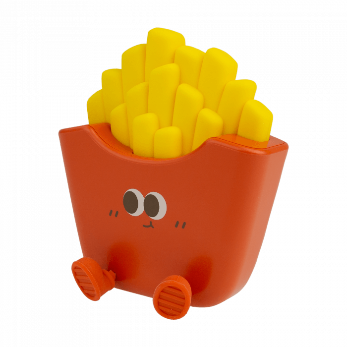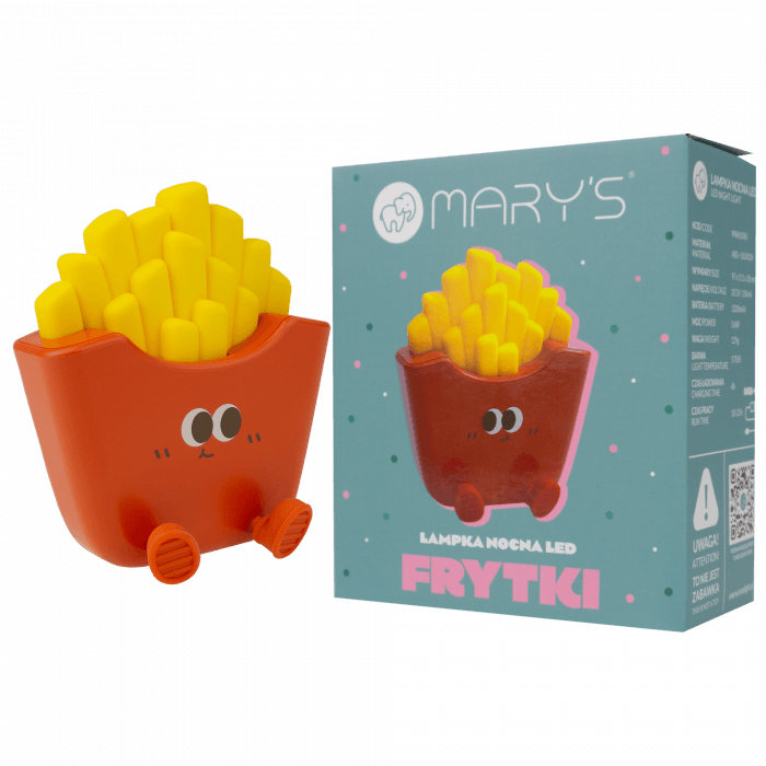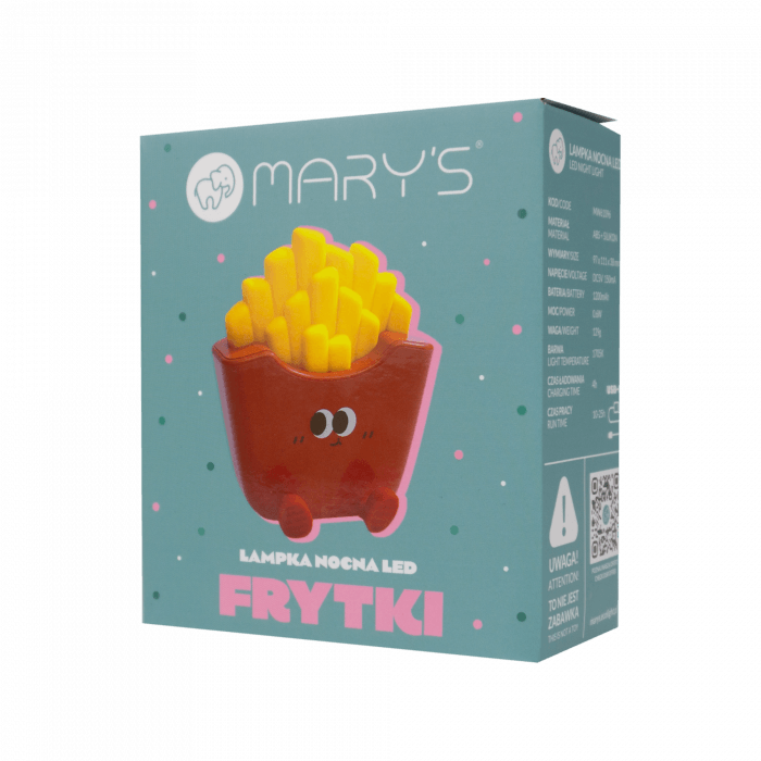 Wesoła lampka w kształcie pudełka frytek – świeci bardzo ciepłym, przytulnym światłem (ok. 1705 K), które świetnie nadaje się na wieczorne wyciszenie. Ma akumulator 1200 mAh (daje od 10 do 25 godzin świecenia), ładuje się przez USB w ok. 4 h. Wykonana z miękkiego silikonu i ABS — zabawna i praktyczna dekoracja do pokoju dziecięcego.