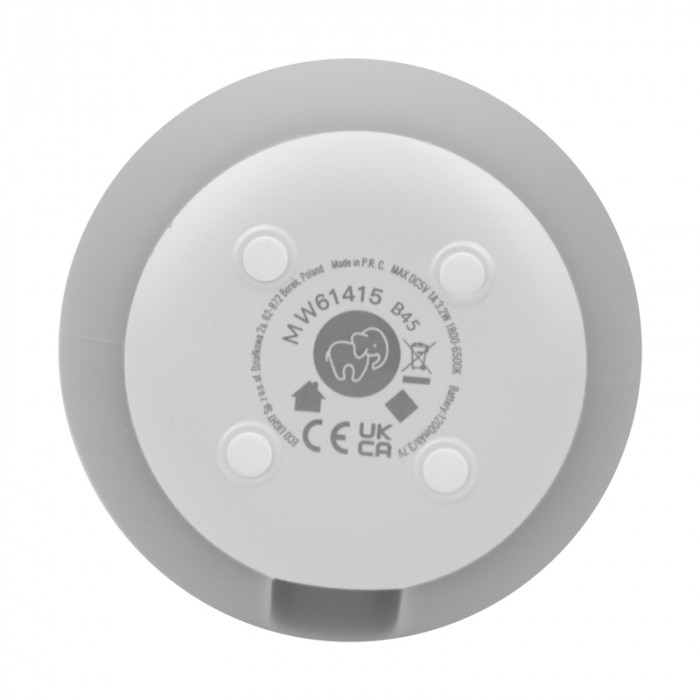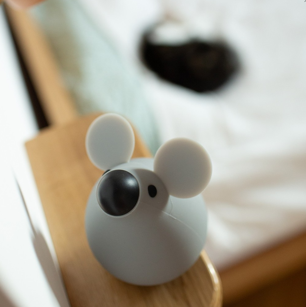 Urocza szara myszka-lampka, która tworzy delikatny, kojący blask dzięki regulacji temperatury światła od ciepłego do zimnego (1800 – 6500 K). Ma akumulator 1200 mAh, ładuje się przez USB w około 3,5 h i świeci bardzo długo — do 200 godzin przy niskiej jasności. Wykonana z bezpiecznego silikonu, ABS i PC — idealna dekoracja i nocny przyjaciel dla dziecka.