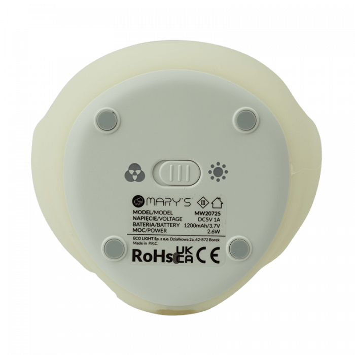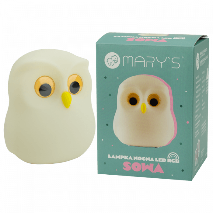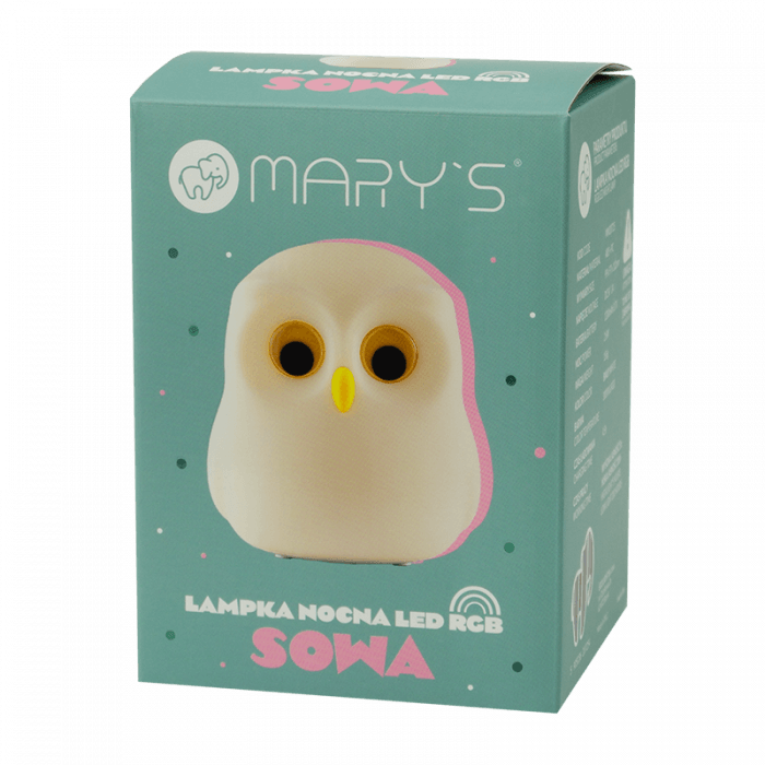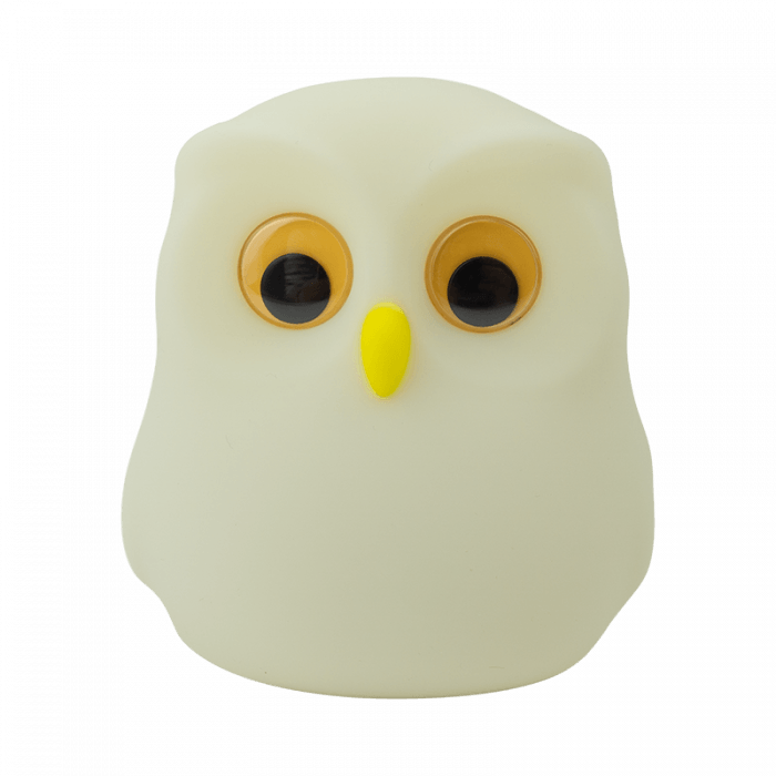 Urocza biała sowa, która świeci ciepłą białą barwą (3000 K) albo mieni się kolorami RGB — idealna do nocnych opowieści. Ma wbudowany akumulator 1200 mAh, ładuje się przez USB (ok. 4,5 h) i może działać do 200 godzin przy niskiej jasności, a do 5 h przy pełnej mocy. Miękka w dotyku dzięki połączeniu silikonu, ABS-u i PC — piękny i praktyczny dodatek do dziecięcego pokoju.