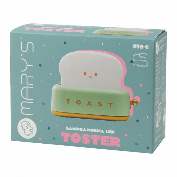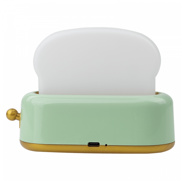 Uroczy zielony toster-lampka, który świeci ciepłym, relaksującym światłem (3000 K). Ma wbudowany akumulator 800 mAh, ładuje się przez USB w około 2,5 godziny i może świecić aż do 120 godzin na niskiej jasności. Idealna dekoracja do dziecięcego pokoju lub jako przytulny element nocnej rutyny.